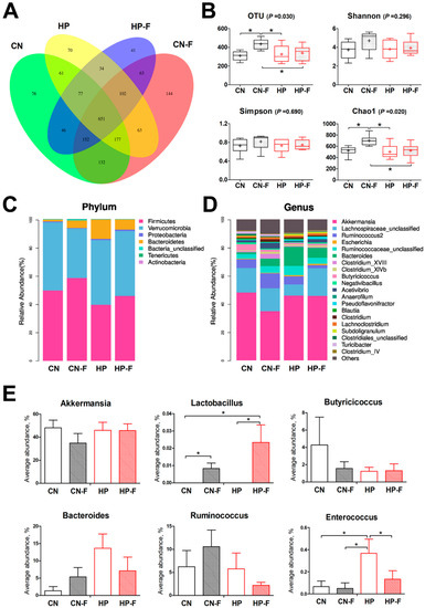 The degrees of gut dysbiosis in cecum of goslings among groups (groups: CN: a basal diet; CNF: replaced 5.0% basal diet with fermented feed; HP: a high-protein diet; HPF: replaced 5.0% high-protein diet with fermented feed). (A) Venn diagram of the observed OTUs; (B) total OTUs and alpha diversity indexes, n = 6; (C,D) microbiome composition at the phylum and genus levels, n = 6; (E) the average abundances of some genera among groups, n = 6. CN: 162.9 g/kg CP, a basal diet; CNF: 167.5 g/kg CP, replacing 5.0% basal diet with fermented feed; HP: 229.7 g/kg CP, a high-protein diet; HPF: 230.7 g/kg CP, replacing 5.0% high-protein diet with fermented feed. Asterisks represent differences between groups being significant (* P < 0.05).