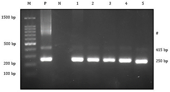 Agarose gel electrophoresis showing the 415 and 250 bp bands of the TiLV genes from the affected fish. Lane M = 1 kb DNA marker; Lane P = positive control; Lane N = negative control; Lane 1 to 5 = All TiLV-positive samples yielded 415 and 250 bp amplicons. #Marks band are from cross-hybridizations between amplified products.