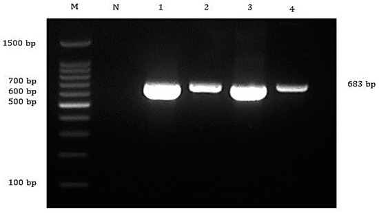 Agarose gel electrophoresis showing detection of 683 bp of Aeromonas hydrophila targeting 16S rRNA gene from the affected fish. Lane M = 1 kb DNA marker; Lane N = negative control; Lane 1 to 4 = All A. hydrophila-positive samples yielded 683 bp amplicons.