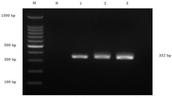 Agarose gel electrophoresis showing detection of 352 bp of Streptococcus agalactiae targeting cpsG gene from the affected fish. Lane M = 1 kb DNA marker; Lane N = negative control; Lane 1 to 3 = All S. agalactiae-positive samples yielded 352 bp amplicons.