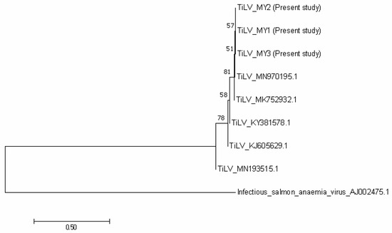 Phylogenetic tree showing the relationship between the three TiLV sequences from the present study, and other reference sequences from Malaysia (MN970195.1), India (MK752932.1), Thailand (KY381578.1), Israel (KJ605629.1) and the United States (MN193515.1). The tree is based on the 250 bp of TiLV’s segment 3. The infectious salmon anaemia virus was considered as an out group.