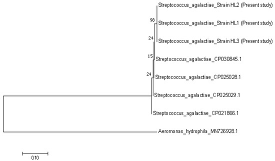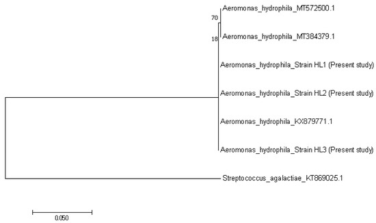 Phylogenetic tree showing the relationship between the three Aeromonas hydrophila sequences from the present study, with other reference sequences from Algeria (MT572500.1), India (MT384379.1) and Iran (KX879771.1). The tree is based on the 683 bp 16S rRNA gene of A. hydrophila. Streptococcus agalactiae was considered as an out group.
