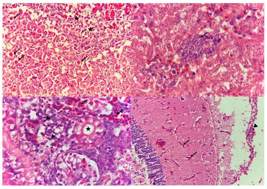 Photomicrograph of the liver, kidney and brain of the naturally co-infected red hybrid tilapia by Tilapia Lake Virus, Aeromonas hydrophila and Streptococcus agalactiae. (A) Infiltration of lymphocytic inflammatory cells (stars) and eosinophilic intracytoplasmic inclusion bodies (arrows) in the liver section (40×, H&E). (B) Syncytial giant cell exhibiting multiple nuclei (arrow) in the liver section (100×, H&E). (C) Mild renal tubular degeneration (star) and haemorrhages (arrows) in the kidney section together with moderate infiltration of mononuclear inflammatory cells (arrow heads) (100×, H&E). (D) Mild congestion (black arrows) and infiltration of lymphocytes (arrowhead) in the meninges (40×, H&E).