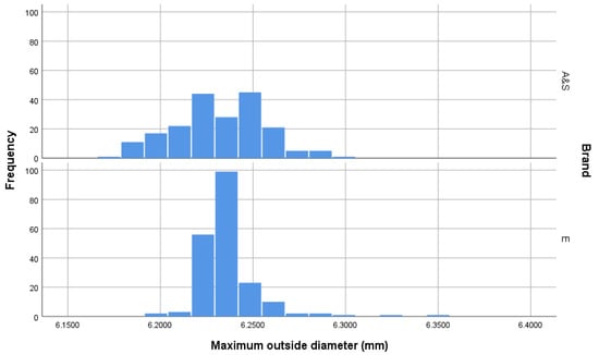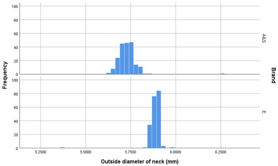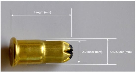 All the cartridges were within expiry dates and stored in dry conditions. Each cartridge was designated with a number and weighed on a Sartorius balance (Sartorius ENTRIS124-1S Analytical Balance, 120 × 0.0001 g, Sartorius Stedim Biotech North America Inc., New York, NY, USA), and then the figure was recorded. The cartridge dimensions were then measured using Brown and Sharpe, 0 to 200 mm Range, 0.01 mm Resolution, IP67 Electronic Caliper, Stainless Steel with 50 mm Stainless Steel Jaws, 0.03 mm Accuracy callipers (Brown and Sharpe Manufacturing Co., Providence, RI, USA) and the length, outer diameter and inner diameter (