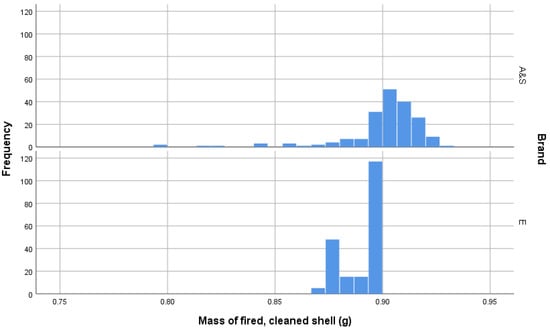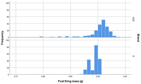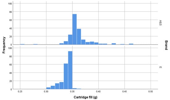 The Eley cartridges appear to have been produced to a stricter tolerance range than the AS cartridges. The measurement of cartridge dimensions illustrated that the Eley cartridges had a lower variation in outer diameter (OD Max) (AS = 6.232 mm ± 0.0246