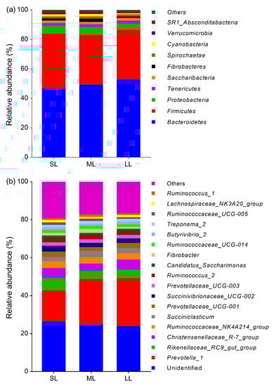 Effects of roughage length on ruminal bacteria at phyla (a) and genus (b) levels. SL: short length; ML: medium length; LL: long length.