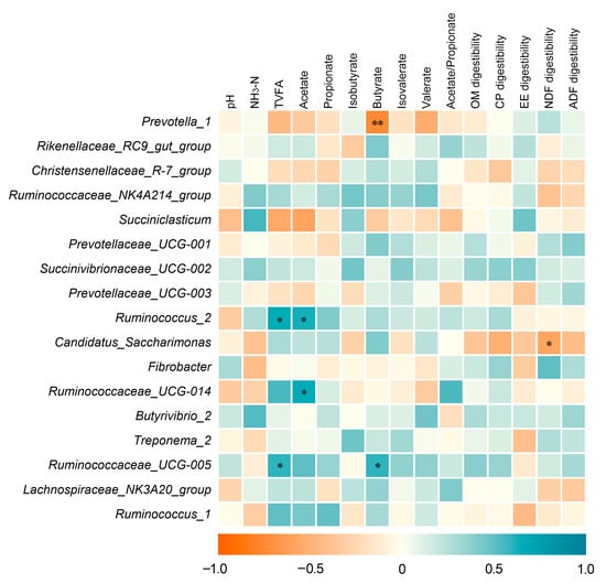 Correlation between fermentation products, nutrient digestibility, and rumen bacteria. The genera representing at least 1% of the bacterial community are presented. The blue lattices denote that the correlation is positive (closer to 1), and the red lattices denote that the correlation is negative (closer to −1) between ruminal bacteria and fermentation parameters. * p < 0.05; ** p < 0.01.