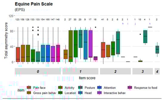 Distribution of item scores for Equine Pain Scale (EPS). Total asymmetry score is presented on the y-axis. Scale items are presented on the x-axis and divided into the item scores given (ranging from 0 to 4). Letters in the diagram: h—head position, i—interactive behavior, j—pain face, k—response to food.