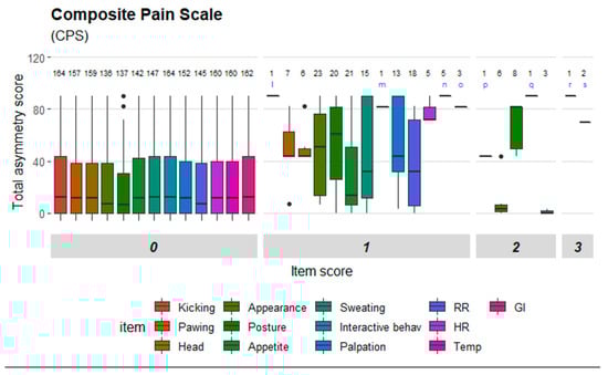 Distribution of item scores for Composite Pain Scale (CPS). Total asymmetry score is presented on the y-axis. Scale items are presented on the x-axis and divided into the item scores given (ranging from 0 to 3). Letters in the diagram: l— kicking abdomen, m—interactive behavior, n—rectal temperature, o—digestive sounds, p—pawing on the floor, q—appetite, r—appetite, s—respiratory rate.
