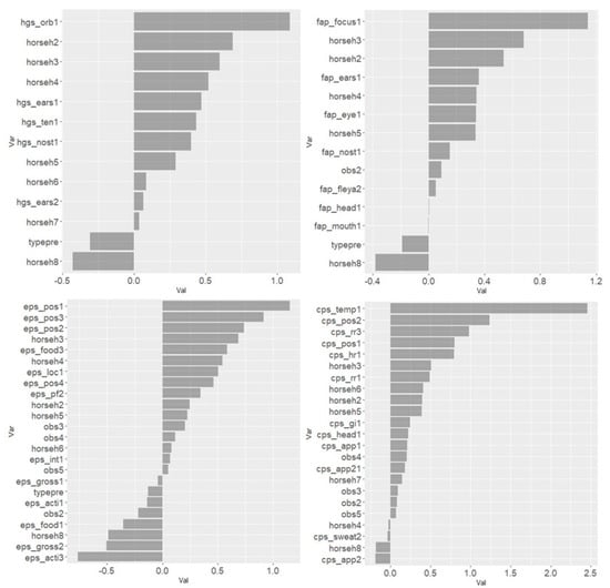 The results from the Lasso regression indicated that the combination of following scale items within each scale were most strongly associated with the total asymmetry score: ‘orbital tightening’ for HGS, ‘focus’ for EQUUS-FAP, ‘posture’ for EPS, and ‘temperature’ and ‘posture’ for CPS (Figure 5). For all scales, horses h1–h8 seemed to be relatively strongly associated with total asymmetry score and horse h4 in particular had a strong association on three scales. The effects of horse and observer were accounted for in scale items associated with total asymmetry score. Scale items negatively associated with total asymmetry score were ‘teeth grinding’ (EQUUS-FAP), ‘gross pain behavior’ (EPS) and ‘sweating’ (CPS). The model best describing changes in movement asymmetry with all scale items included was ‘posture’ in CPS and EPS, together with ‘temperature’ and ‘heart rate’ in CPS, and ‘focus’ in EQUUS-FAP (Figure 6).