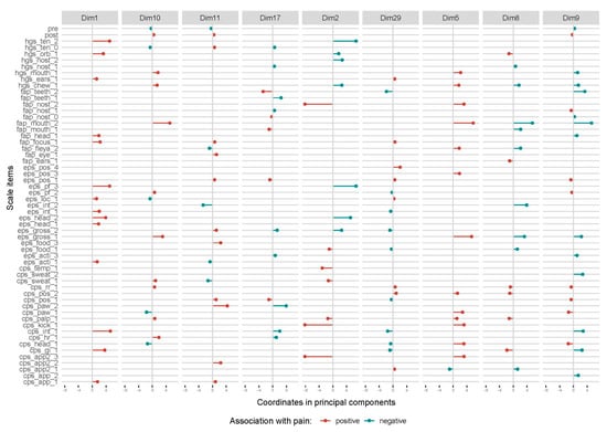 Thirty-three MCA-dimensions explaining from 10% to 1% of the variation in the data were included in the linear regression. Nine dimensions were significantly associated with movement asymmetry (Table 2) and the composition of these dimensions is presented in Figure 7. Facial expressions and ‘pain face’ were seen together with ‘interaction’ and ‘activity’ parameters in horses with increased total asymmetry score in dimension 1, with ‘gross pain behavior’ and ‘postural changes’ in dimension 5, and ‘gross pain behavior’ in dimension 10. Dimension 29 was most strongly associated with movement asymmetry and involved an interesting combination of behaviors (‘stiffly backwards ears’, ‘focus’, ‘posture’, ‘location’ and ‘appetite’) and lack of pain-related facial expressions in horses with increased total asymmetry score. ‘Interaction’, ‘gross pain behavior’ and ‘head position’ were other behaviors not seen in horses in this dimension. A similar pattern was seen for dimension 8 and 9, where many facial expressions and ‘gross pain behavior’ had a negative association with movement asymmetry, while ‘posture’ and ‘pawing’ had a positive association. In dimension 2, facial expressions and ‘pain face’ were not seen in horses with increased total asymmetry score if they showed gross pain behaviors, were kicking, had lowered head and decreased appetite, and had increased temperature.
