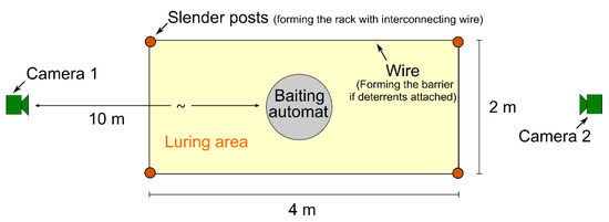 Major attention was paid to the standardization of the sites. The carcasses as a potential entity of attraction to wild boar were substituted by a small luring area equipped with a baiting automat “WGI Futterautomat Quick Set™ 270” [10] (NewRoads, LA, USA). The luring area was bordered by a rectangle (2 × 4 m, see Figure 2) comprising four slender posts interconnected by a slim wire at a height of 1.6 m. The latter served as a rack to carry the deterrents under test (blank for the control site). The rectangle also defined the decision border with respect to the discrimination between success and failure of deterrence. Each site was monitored by two wildlife cameras facing towards each other at a distance of 10 m from the baiting automat. The cameras were fixed to massive wood trunks driven into the ground rather than to available trees to assure exactly the same layout of the sites.