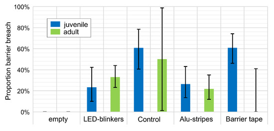 The effect of the physical deterrents is illustrated in Figure 3. Since study site 1 was only frequented by very few wild boar prior to testing (Table 1 and Table 2) the site was left blank. As compared to the control site, relatively few wild boar passed the barrier, when the LED blinkers and aluminum strips were in place. Barrier tape seemed to have no effect, at least not with respect to juvenile animals. Generally, juvenile wild boar seemed to be more prone to pass the barrier than adults, except in the experiment with LED blinkers.