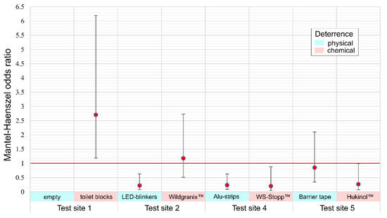 Summary odds ratios (odds of barrier breach at test site versus control site) are depicted in Figure 5. Odds ratios are more than 2.5 times increased for toilet blocks with the confidence interval not passing through one (odds equal to control) indicating that toilet blocks had a significant effect of attraction rather than deterrence on wild boar. LED blinkers, aluminum strips, WS-Stopp™ and Hukinol™ all had a marked and significant deterring effect with odds ratios under 0.3—i.e., reducing the probability of a barrier breach to about one third.