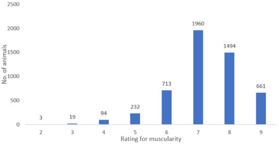 Figure 1 shows the frequency of the rating for muscularity, which is only evaluated at FCS fattening stations and ranges from within 2 points (3 cases) to 9 points (661 cases). Data show that the greatest number of animals (1960) was rated grade 7, or above-average muscularity.