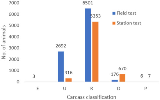 The distribution of the ratings of carcass quality as per the SEUROP classification of carcass quality are illustrated in Figure 2. The data show the comparison between the S and F methods. It is clear that the greatest discrepancy in the number of cases is in the U class (316 vs. 2692). There is also a higher frequency in the case of the R class in the F method, and conversely, a higher frequency of the O class in stations. The SEUROP classification is a subjective rating, where animals are rated by a greater number of assessors, particularly in the F method, which may affect actual evaluation. The lower age at slaughter may also result in lower meat yield values in the S method. The frequency of classification according to SEUROP obtains better results in the Fleckvieh breed than in dairy breeds, e.g., the Polish Holstein breed has the highest frequency of bulls in class O and no animal in class E [24,25]. On the other hand, the frequency of classification of first-class beef breeds (Piemontes) ranges in the opposite values according to SEUROP. Carcass analysis of Piemontes bulls in Italy gives classes according to SEUROP ranging from S+ to U [20].