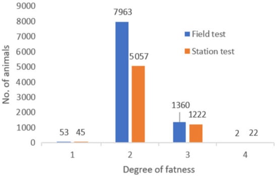 Considering the greater size of the group of bulls fattened at FCS, it can be stated that the trends observed for individual classes for the degree of fatness (Figure 3) is comparable for both methods. Bulls in method F only show higher values in relation to the Grade 2 fatness. Nearly identical classification ratings for the degree of fatness are also given by other authors [25,26].