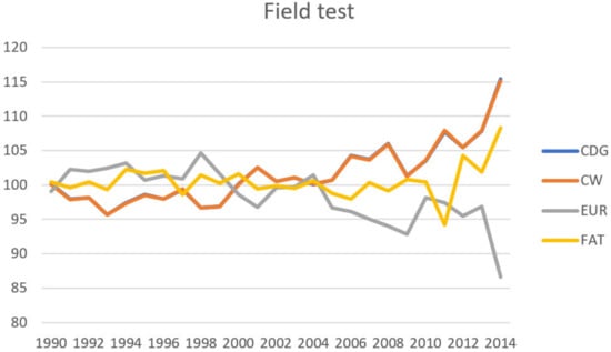 Estimates of genetic parameters for individual pairs of traits, which occur in both the F method and the S method (Table 8), were calculated in order to establish possible similarities between the station and field test. These pairs (calculated for both methods F and S) were CDG, CW, EUR and FAT and appeared in the calculation as independent traits, which means that the genetic correlation (rg) between them was estimated. Heritability (h2), which confirm the higher values for method S, as mentioned earlier in Table 6 and Table 7, are also presented. A comparative genetic correlation (rg) value for CDG between the field and station tests of 0.75 [1], was established in Piemontese cattle in Italy. Groenveld et al. [32] pursued the link between the station and field tests for individual meat yield indicators in Slovakian pig population. They state a genetic correlation between the weight gain established by station and field tests in a value ranging from 0.42–0.53, i.e., a significantly lower value when compared to the values we established for cattle.