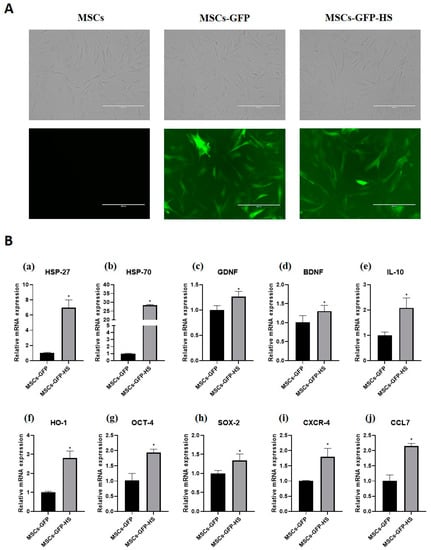 When observed through a fluorescence microscope, the MSCs-GFP and MSCs-GFP-HS expressed green fluorescence and all cells showed similar morphology to fibroblasts (Figure 1A). Heat shock treatment was identified by the genes related to heat shock response. Heat shock protein 27 (HSP-27) and heat shock protein 70 (HSP-70) were highly upregulated in the MSCs-GFP-HS group (Figure 1a,b, p < 0.05). The expression of neurotropic factors, such as glial cell-derived neurotrophic factor (GDNF) and brain-derived neurotrophic factor (BDNF), was upregulated in the MSCs-GFP-HS group (Figure 1c,d, p < 0.05). Regarding the expression of anti-inflammatory gene markers, interleukin 10 (IL-10) and heme oxygenase 1 (HO-1) were significantly upregulated in the MSCs-GFP-HS group compared with that in the MSCs-GFP group (Figure 1e,f, p < 0.05). Comparing the expression levels of stemness-related genes, octamer-binding transcription factor 4 (OCT-4) and SRY-box transcription factor 2 (SOX2) were upregulated in the MSCs-GFP-HS group (Figure 1g,h, p < 0.05). The homing factors C-X-C chemokine receptor type 4 (CXCR-4) and C-C motif chemokine ligand 7 (CCL7) were significantly upregulated in the MSCs-GFP-HS group (Figure 1i,j, p < 0.05).
