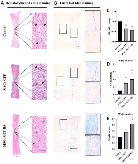 Histopathological analysis of the stained injured spinal cords. (A,B) Images of the injured spinal cord sections of the control, MSCs-GFP, and MSCs-GFP-HS groups. The sections were stained with hematoxylin and eosin (H&E) and Luxol fast blue (LFB) to identify fibrotic changes, hemorrhages, vacuolar formation, parenchymal change, and degree of myelination. Scale bar represents 200 μm for all images. In the LFB staining image, the lined box is the magnified image of the grey matter and the dotted box is the magnified image of the white matter. (C) Quantitative comparison of the fibrotic changes is shown as red and pink (arrow) in the H&E staining. (D,E) Quantitative comparison of the grey and white matter myelin level, which is depicted by the intensity of the blue color. (C–E) Each bar indicates the average of four samples per group and was normalized to the control group. Error bars represent standard deviation. * denotes significance compared with the control group at p ≤ 0.05. ^ denotes significance compared with the MSCs-GFP group at p ≤ 0.05.