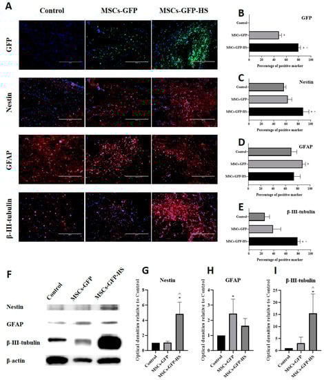 A similar pattern of marker expression in the IHC results was identified in the western blot results (Figure 3F). The expression of nestin and β-III-tubulin was highest in the MSCs-GFP-HS group. Nestin (Figure 3G, p < 0.05) and β-III-tubulin (Figure 3I, p < 0.05) expression were significantly higher in the MSCs-GFP-HS group than in the other groups. As shown by immunohistochemistry, the expression of GFAP was significantly higher in the MSCs-GFP group (Figure 3H, p < 0.05). The expression of GFAP in the MSCs-GFP-HS group was lower than that in the MSCs-GFP group and higher than that in the control group.