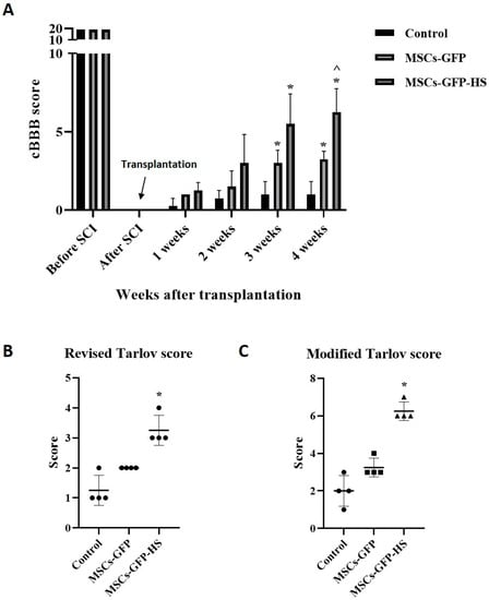 In this study, we injected stem cells during the acute phase of SCI. After SCI, the blood-spinal cord barrier is destroyed, resulting in cell infiltration, inflammatory reactions, and pathological changes in lesions. This change activates astrocytes to create a glial scar, creating an environment that interferes with neural regeneration [,,]. Hence, it is crucial to control inflammation and the microenvironment by administering stem cells early in SCI for neuronal protection. Previous reports showed that MSCs intravenously injected into an acute SCI canine model had antioxidant and anti-inflammatory effects []. Our results showed that expression of the anti-inflammatory and antioxidation-related genes was higher in the HS-treated MSCs group than in the MSCs-GFP group. We found that the HS-treated group had the lowest fibrosis of the lesion and more neuronal sparing. Considering the cytoprotective, anti-inflammatory, and antioxidant effects of HS-treated MSCs, these results were likely because of proper control of the inflammatory response that occurs in the early stages of SCI.