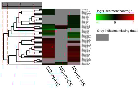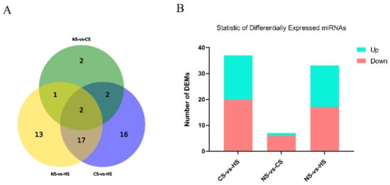 DEMs responding to acute heat/cold stress were identified in the NS group, CS group, and HS group. According to |log2Fold| > 1, p-value < 0.05, there were 33 differentially expressed miRNAs in the NS-HS group, which included 17 significantly up-regulated miRNAs and 16 significantly downregulated miRNAs. Only 7 miRNAs expressed a significant level in the NS-CS group (six upregulated and one downregulated). The CS-HS group had 37 significantly expressed miRNAs which included 20 significantly upregulated miRNAs and 17 significantly downregulated miRNAs (Figure 1).