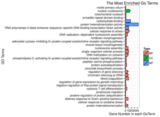 To investigate the biological function of target genes corresponding to the screened DEMs, these target genes were enriched in the GO database. Based on sequence alignment, target genes were distributed to each term and the results were assembled into a bar chart. The cellular component nuclear nucleosome is strongly correlated with differentially expressed miRNA target gene functions (Figure 3). However, the target genes of differently expressed miRNAs were not significantly enriched in molecular function. Many biological processes such as DNA methylation on cytosine, regulation of gene silencing, chromatin silencing at rDNA (Ribosomal DNA), and protein heterodimerization are remarkably related to miRNAs regulation. One of them, the cellular response to stress, was our focus in this research and differently expressed miRNAs exerted an important impact on this biological process.