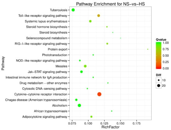 Pathway enrichment analysis of differentially expressed miRNA target genes for normal (NS)-vs-heat stress (HS). The larger circle area means the more differently expressed gene number. The Q value represents a significant level (p-value < 0.05).