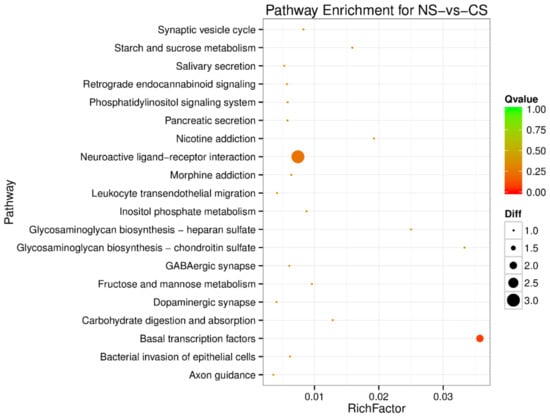 Pathway enrichment analysis of differentially expressed miRNA target genes for NS-vs-cold stress (CS). The larger circle area means the more differently expressed gene number. The Q value represents a significant level (p-value < 0.05).