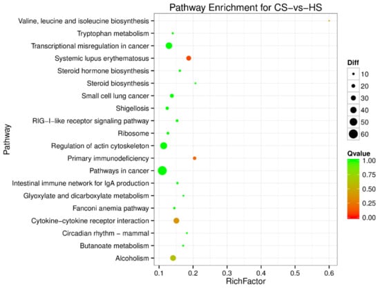 Pathway enrichment analysis of differentially expressed miRNA target genes for CS-vs-HS. The larger circle area means the more differently expressed gene number. The Q value represents a significant level (p-value < 0.05).