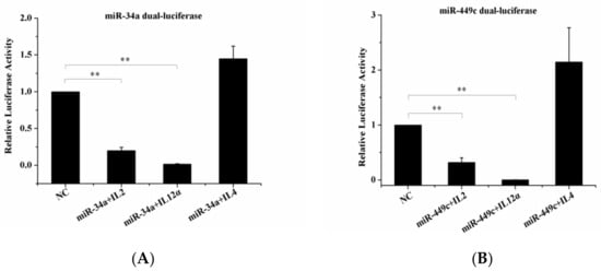 Dual-luciferase reporter gene assay confirmed targeted binding between IL-2, IL-12α, and miR-34a, miR-449c. (A): 293-T cells were transfected with miR-449c mimic or an NC vector and then analyzed for miR-34a expression. (B): 293-T cells were transfected with miR-34c mimic or an NC vector and then analyzed for miR-449c expression. ** p < 0.05 compared with the NC group.