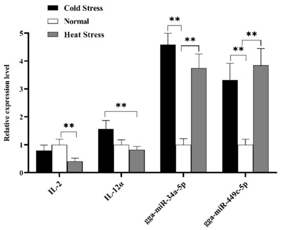 Through miRNA sequencing analysis, only 7 miRNA were found in the CS-NS group, however, we found 33 and 37 differential miRNA in the spleen tissues of the HS-NS group and HS-CS group, respectively. Compared with cold stress, heat stress is more likely to affect the expression of miRNA. Moreover, we determined that miR-34a and miR-449c were important factors regulating the interaction of immune cytokines. They belong to the same family and target IL-2 and IL-12α simultaneously.