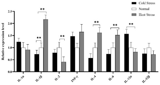 Furthermore, cytokines profile in splenic tissue was constructed to elucidate the immune mechanism in acute cold/heat stress. In comparison to the CS and NS group, IL-1β significantly up-regulated at extremely higher expression levels in the HS group (Figure 9), and the expression level of IL-4 in the HS group was significantly higher than that in the CS group. IL-6 expression levels showed an upward trend in the HS group compared to other groups, but the expression level of IL-1α showed a downward trend. The INF-γ expression level was higher in the HS and CS group than in the NS group.