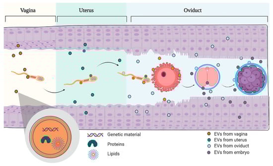 Schematic representation of the sperm travel through the female reproductive tract. Sperm enter in contact with the different extracellular vesicles produced in the vagina, the uterus and the oviduct. Once fertilization takes place, the embryo will come into contact with the EVs produced by the oviduct and the uterus where the embryo and the future fetus will remain for the rest of the pregnancy until delivery. Note that the embryo also produces EVs that allow bidirectional communication with the mother tissue (oviduct).