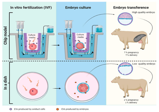 Based on the broad-spectrum possibilities for EVs application, EVs have been postulated as potential non-invasive biomarkers. For example, EVs can be used as a biomarker for embryo quality [90,91,92] to select good embryos before transferring them to female recipients or to know the receptivity/health of a uterus before performing an embryo transference [93]. In addition, the increasing knowledge about the role of EVs on reproductive events and ART efficiency will lead to the next challenge for the biology of reproduction field: the large-scale production of EVs to use them as additives to gametes and embryo culture media. This might be addressed easily in livestock animals by the use of animal’s remains from abattoirs; where moreover this strategy is in accordance with the three rules of animal welfare. Similarly, EVs can be obtained from the biological material originated in the daily practice of vet clinics, as it is the castration of domestic animals (i.e., cats and dogs). Nevertheless, both strategies are time consuming and it might present contaminations with other biological fluids. The future of EVs development as a real alternative tool to boost ART results involves the optimization of the oviduct-in-a-chip model prototype to culture in vitro embryos before transferring them to female recipients (See Figure 2).