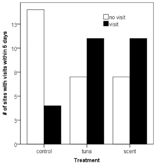 Tuna experiments produced on average 7.25 times as many images per visit than the control camera traps (Mann–Whitney U test, Z = −2.653, p = 0.017); similarly, scent lures produced on average 18.7 times as many images per visit than the control traps (Mann–Whitney U test, Z = −2.776, p = 0.012). There was no difference between the tuna and scent experimental camera traps (Mann–Whitney U test, Z = −0.343, p = 0.743). When applying a Bonferroni adjustment (threshold 0.017), both initially significant post-hoc tests remained significant.