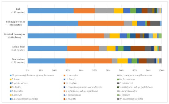 Finally, the Lactococcus genus represented 0.6% with a species identified only in the milk and air samples from the milking parlour, namely Lc. Lactis, while the genus Streptococcus with 0.4% is represented by two species, S. gallolyticus ssp. gallolyticus (0.3%) and S. infantarius subspp infantarius (0.1%), only identified in the milk samples.