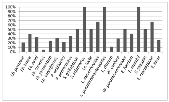 The Weissella genus represented 6.4% of the total with two species identified, W. confusa (5.8%) and W. paramesenteroides (0.6%), while the Leuconostoc genus only represented 1.8% of the total with three identified species: L. citreum (1.3%), L. mesenteroides (0.4%) and L. pseudomesentereoides (0.1%).