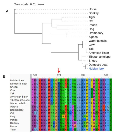 An illustration of the ATP binding cassette subfamily A member 12 (ABCA12) phylogeny tree and alignment data used for dN/dS analysis. (A) The maximum likelihood phylogenetic tree from ABCA12 amino acid sequences of 16 species used for dN/dS analysis. (B) The multiple sequence alignment of the 16 species used of dN/dS analysis showing amino acid site (M570T) under positive selection in ABCA12 gene.
