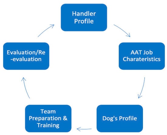 As already noted, the processes currently used in AAA and assistance dog models have marked differences from what is needed in AAT. There is also enormous variability between dogs and how they work with their handlers [49]. In order to create an effective working model for AAT, the authors propose a systematic process in line with the recommendation of [49] that considers matching a dog with the handler and the specific job characteristics, more individualized team preparation and training, and a more frequent contextual evaluation process that allows for the variables inherent in AAT practice. The attributes of ideal dogs to work in AAT vary with what one hopes to achieve with them. The therapy settings, therapy environments, participant groups, procedures, intended therapy outcomes, forms of interactions between humans and animals, and tasks the dog fulfils, all need to be carefully considered as part of this process, and no single dog is likely to be excellent or appropriate in all situations. Once these unique characteristics are identified, they can then be evaluated and re-evaluated over time. The authors elaborate on this within the context of an ongoing cycle, as illustrated in Figure 1.