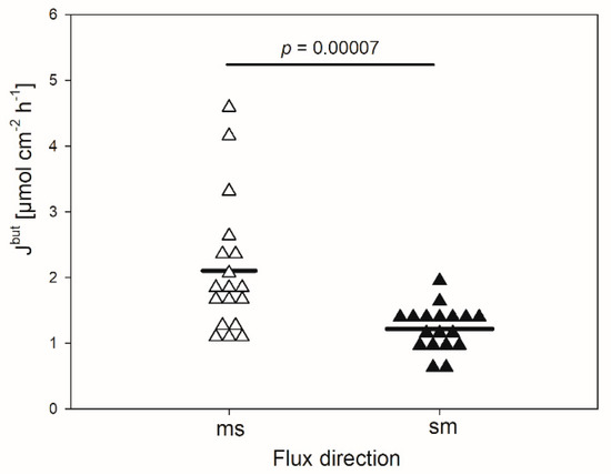 In the absence of any inhibitor, the mean flux rate of butyrate in the mucosal to serosal direction (Jmsbut) amounted to 2.1 ± 1.01 µmol cm−2 h−1 (Figure 1). It was significantly higher than the flux rate in the opposite direction (Jsmbut, 1.2 ± 0.34 µmol cm−2 h−1, p < 0.001). Hence, a net absorption of butyrate was observed under the conditions applied, ruling out transport by simple diffusion.