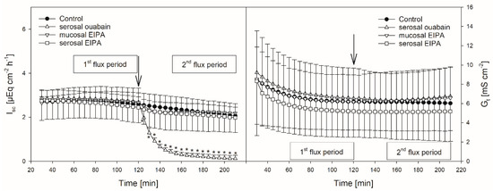 Isc (left) and Gt (right) over time in the presence or absence of EIPA or ouabain, respectively. Arrows mark the time of inhibitor application. Asterisks indicate values significantly different from the control. Boxes indicate the two flux periods corresponding to Figure 3 (mean ± SD; paired Student’s t-test; N = 8).
