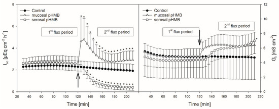 Course of Isc (left) and Gt (right) over time in the presence or absence of pHMB in the mucosal or serosal buffer solution. Arrows indicate the time when pHMB was applied. Asterisks mark values that differ from control with p < 0.05. Boxes visualize the two flux periods, corresponding to Figure 5 (mean ± SD; N = 6; paired Student’s t-test).