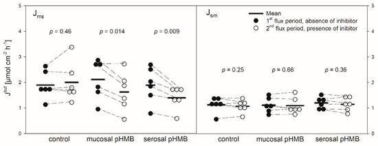 Jmsbut (left) and Jsmbut (right) across the reticulum epithelium in the presence or absence of pHMB in the mucosal or serosal buffer solution. Flux rates were measured for one hour in the absence of pHMB (1st flux period). Then, pHMB was added to the mucosal or serosal buffer solution. After 30 min incubation with the inhibitor, the flux rates were measured for another hour (2nd flux period). Each data point represents one animal. Solid horizontal lines indicate the mean value of the group. Dashed lines connect the corresponding data points of the same animal (paired Student’s t-test; N = 6).