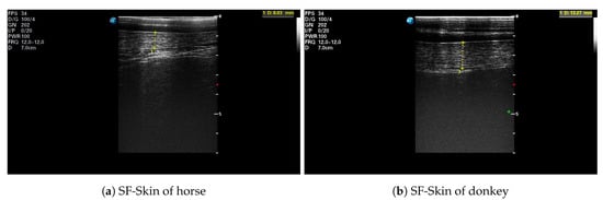 After each IRT imaging, an ultrasonographic image was taken with an ultrasound scanner (SonoScape S9, SonoScape, Shenzhen, China) using a linear 5–12 MHz transducer (L752, SonoScape, Shenzhen, China). Ultrasound scans were performed with the transducer placed on the animal’s back, over the third lumbar vertebra, perpendicular to the spine. All images were collected on the left side of the animal [37]. The hair was trimmed at the measurement place, and ultrasound gel (Aquasonic 100, Parker Laboratories Inc., Fairfield, NJ, USA) was used as a coupling medium. The real-time ultrasonographic examination was frozen, and the image was saved, as well as the subcutaneous fat (SF) plus skin thickness (SF-Skin) measurements were obtained. An example of an ultrasonographic image is presented in Figure 1. The hair coat samples were taken from the mid-neck approximately 5 cm below the base of the mane. The length of individual hairs was determined from a random sample of five pulled strands, including the roots [38].