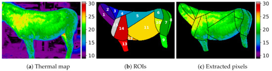 Visualization of a donkey D.3: (a) thermal data from the camera as a thermal map; (b) annotated classes corresponding to selected ROIs (see Section 2.2.1); (c) extracted pixels used in the experiments