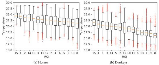 Visualization of temperatures in ROIs (ordered by their medians) of all animals: (a) horses; (b) donkeys.