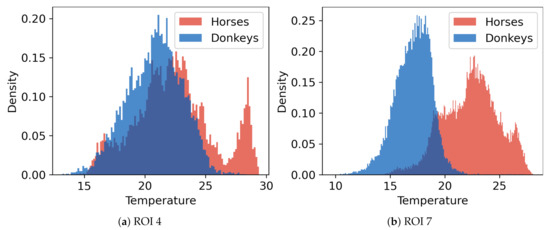 A comparison of temperatures between ROIs is presented in Figure 4. The surface temperatures for horses were, on average, higher than for donkeys, which was confirmed as statistically significant for every ROI (MWW, ). Considerable variances in ROIs’ temperatures and the presence of many outliers were observed. Example histograms for two ROIs with the most extreme differences in mean temperatures of horses and donkeys are presented in Figure 5. The individual differences in animal surface temperatures resulted in multi-modal temperature distributions, as, e.g., in Figure 5a. Histograms of temperatures for all ROIs can be found in Figure A1 in Appendix A.