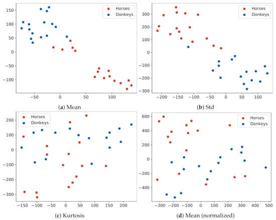 . t-SNE visualization of the dataset. Every dot represents an animal described with features extracted from the pixels of its 15 ROIs. Plots present different feature extraction statistics: (a) the mean; (b) the standard deviation; (c) the kurtosis; (d) the mean, after removing the global mean temperature of an animal from all pixel values. Notice that the examples in Plot (a) form clusters that correspond to the species of the animal, although some examples are in the wrong cluster.